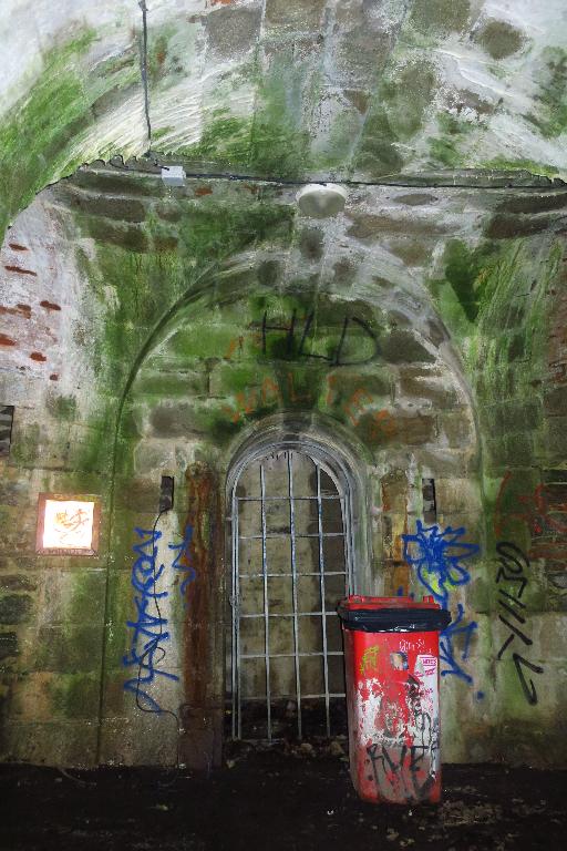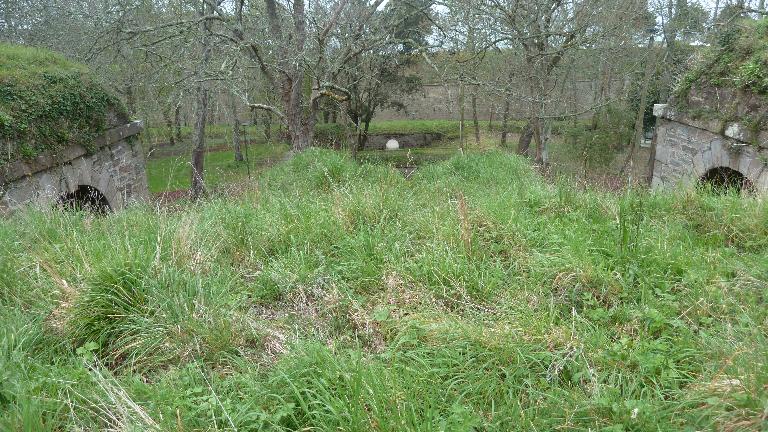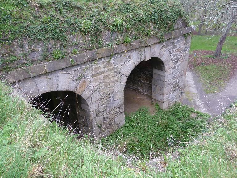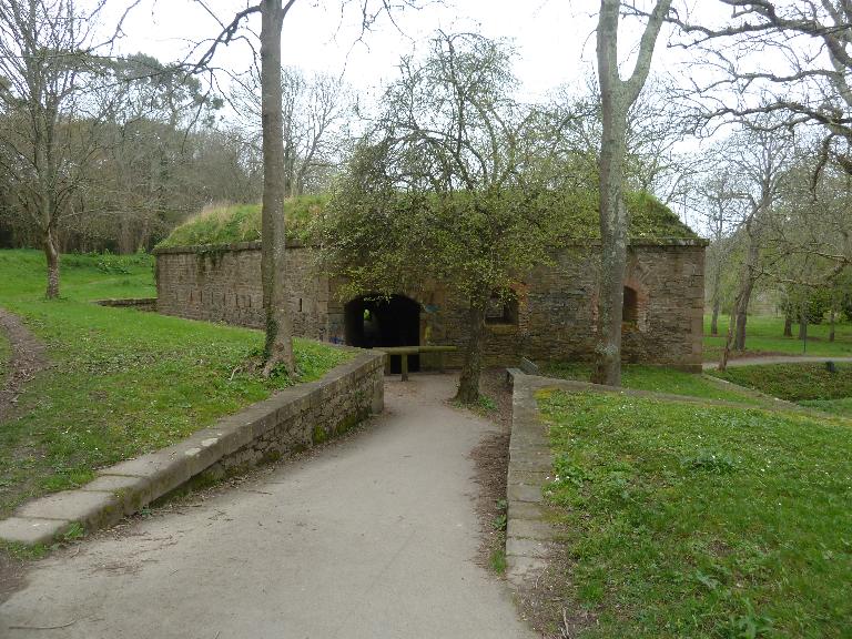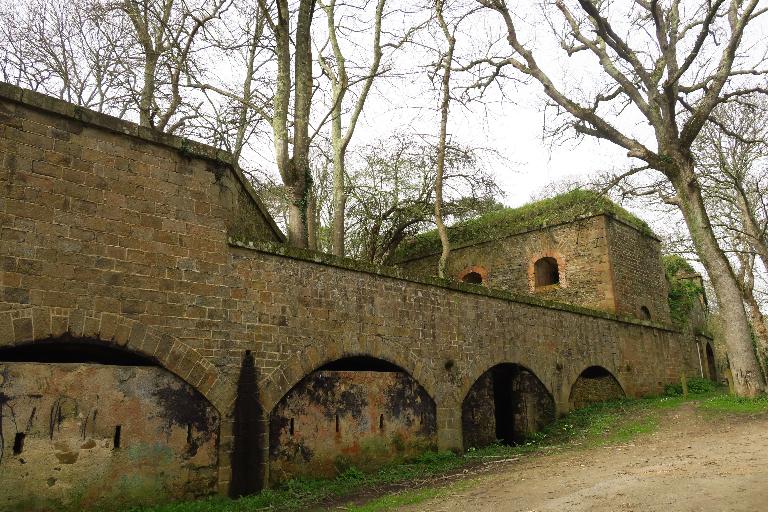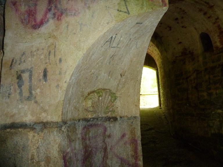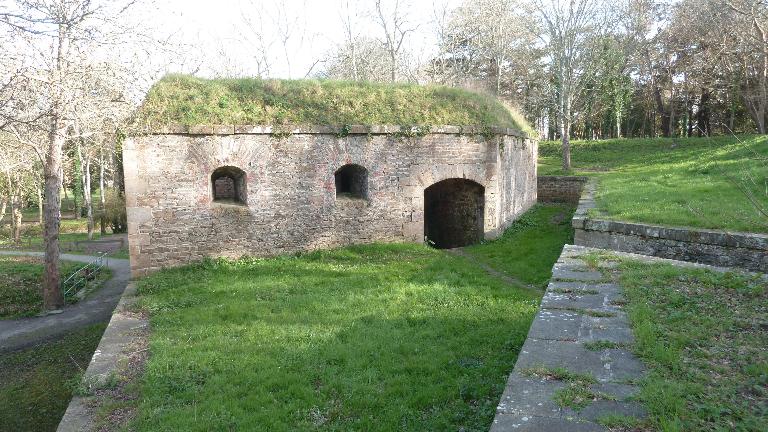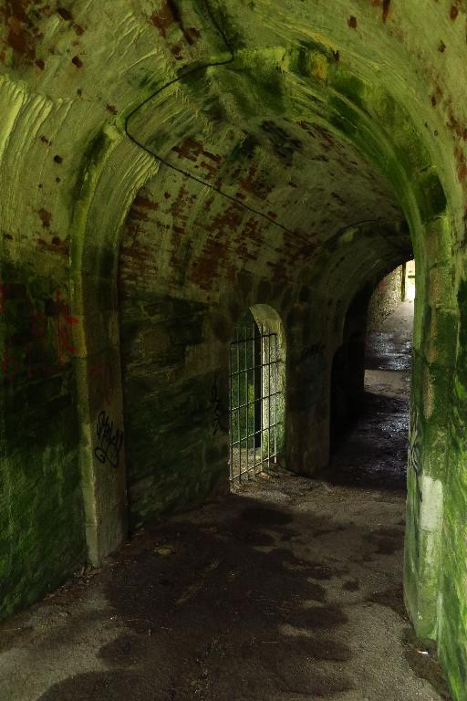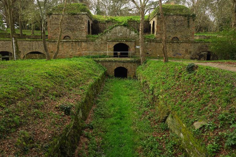 Les dispositions défensives sont omniprésentes. Les deux issues supérieures de la grande galerie sont battues par des créneaux de tir depuis la galerie frontale et les casemates des flancs. Des rainures pratiquées dans la maçonnerie permettent de barricader la grande galerie à l'aide de madriers.