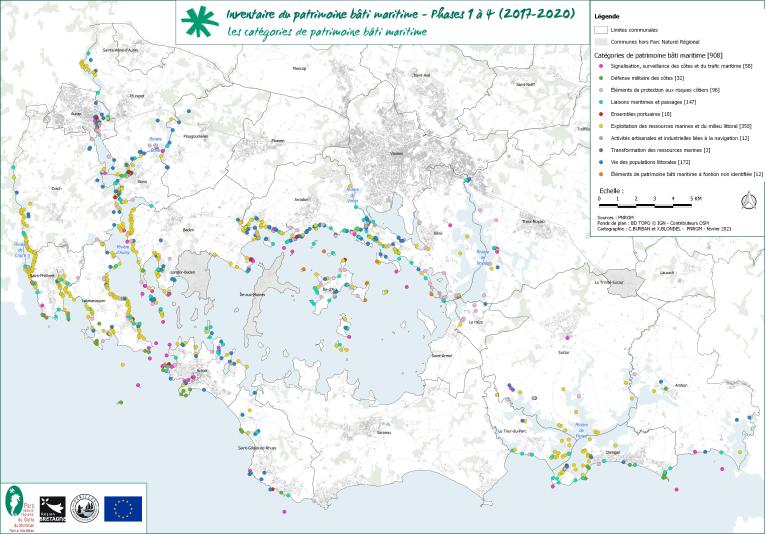 L’opération d’inventaire du patrimoine bâti lié aux activités maritimes recense les éléments présents sur le Domaine Public Maritime1, le trait de côte2 et la surface terrestre des îles et îlots des 22 communes sélectionnées, sur un linéaire côtier total de 486 km. Les communes concernées par l'inventaire sont : Saint-Philibert, Locmariaquer, Crac'h, Auray, Pluneret, Plougoumelen, Le Bono, Baden, Arradon, Vannes, l’Île d’Arz, Séné, Theix-Noyalo, Le Hézo, Saint-Armel, Surzur, Sarzeau, Arzon, Saint-Gildas de Rhuys, Le Tour-du-Parc, Damgan et Ambon. A ce jour, plus de 1000 éléments ont été recensés.