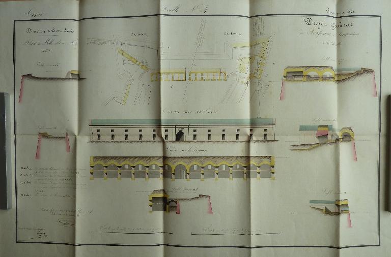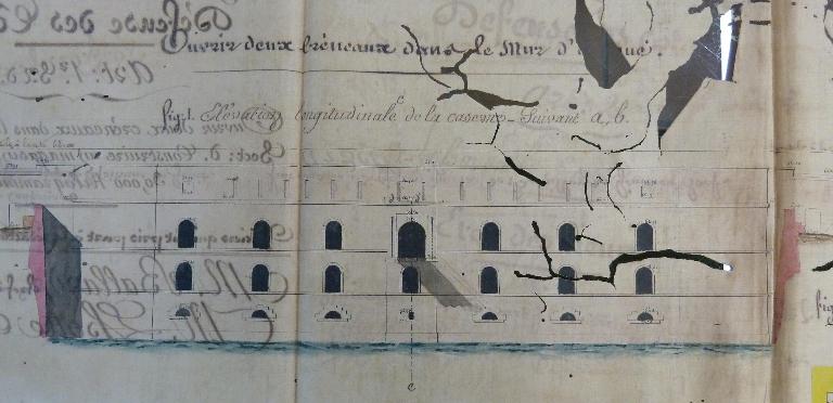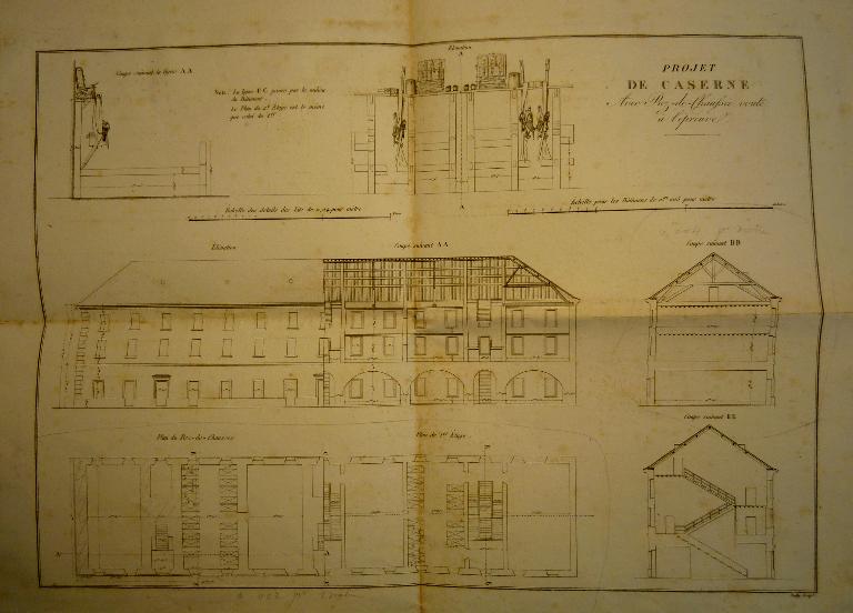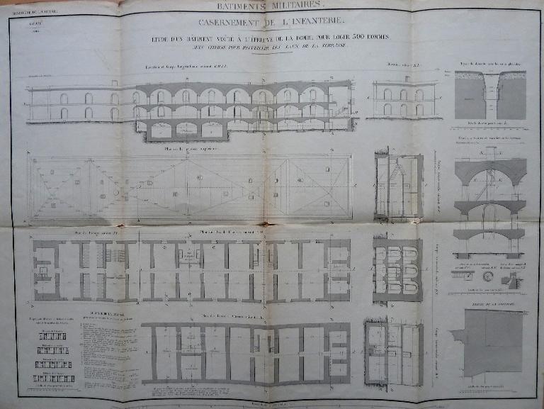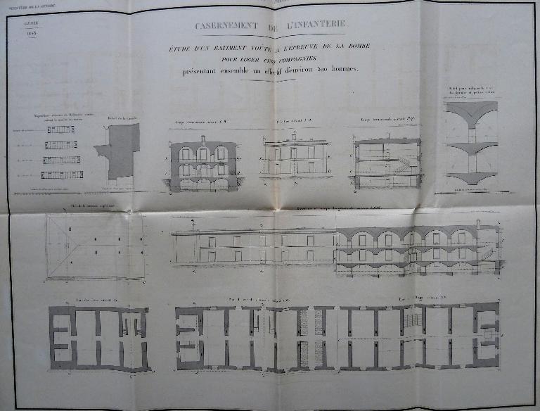 Après 1815, le besoin de construire rapidement les casernes à l'épreuve dont la nécessité vient d'être démontrée lors des sièges subis en 1814 et 1815 relance les études. Le Comité des fortifications cherche alors à déterminer un plan-type applicable massivement. Il arrête un premier type de caserne en 1826. Un officier, Belmas, se distingue alors par ses propositions de caserne à l'épreuve directement inspirée de son projet de caserne d'infanterie : un bâtiment isolé rectangulaire, constitué d'une juxtaposition de travées transversales voûtées en berceau sur plusieurs niveaux. Ses idées inspirent les projets de construction de casernes à l'épreuve à partir de la seconde moitié des années 1820. L'aspect défensif se retrouve quand ces bâtiments sont placés à la gorge des ouvrages.
