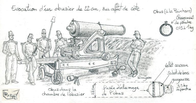 Les marines de guerre n'emploient plus que les plus forts calibres, et la marine à vapeur portera ces redoutables moyens de destruction sur beaucoup de points où la marine à voiles ne pouvait se montrer. Il convient que la défense des côtes puisse opposer des calibres d'une puissance qui ne soit pas inférieure à celle de l'attaque. Toutes les batteries stables tirant à la mer seront donc armées en obusiers de 22c, en canons de 30 ou de 36 et en mortiers de 32c, et il n'y aura pour chaque calibre sur les côtes qu'un seul modèle de bouche à feu.