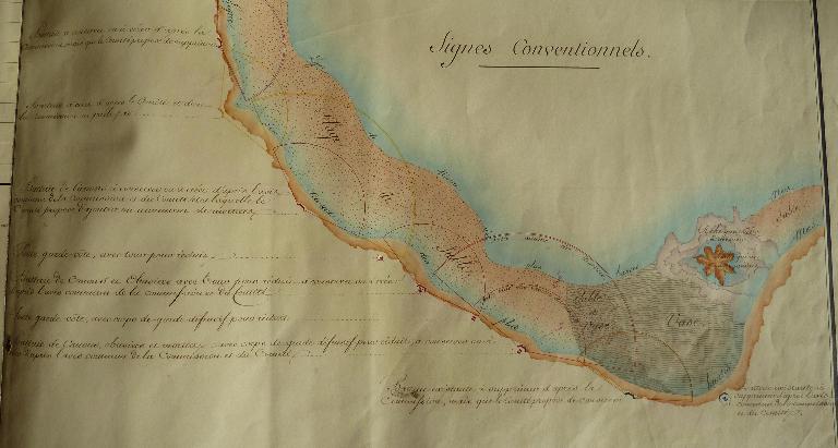 Mais le Directeur des fortifications a fait observer que le fort dont il s'agit étant exclusivement destiné à interdire aux corsaires ennemis le mouillage de la Chambre, ses 50 mètres de développement de parapet en terre sur la face circulaire à l'Ouest, et ses 25m00 sur celle du Sud, étaient plus que suffisants pour recevoir les quatre pièces qui doivent composer son armement ; et il a ajouté que comme l'ouvrage n'est pas attaquable sur le reste de son développement, on a jugé, de tous temps, qu'un simple parapet en maçonnerie devait être préféré comme plus défensif, puisqu'il permettait de voir au pied de revêtements mal flanqués. Il reconnaît d'ailleurs que le complément du terrassement du terre-plein sur la partir de la face Sud où il n'existe pas, serait sans doute désirable mais il rend compte, en même temps, que le manque de remblais a empêché de faire ce terrassement, lors de la construction du fort.