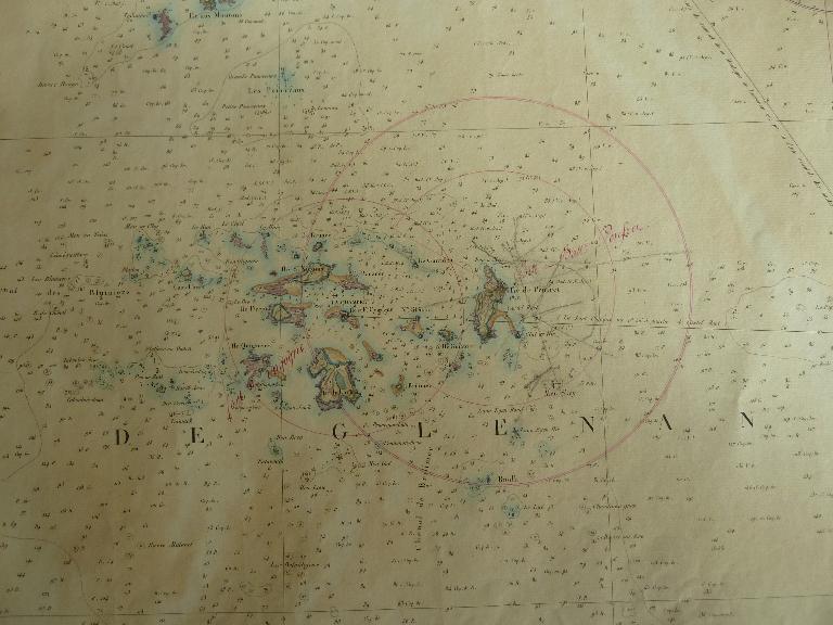 Mais bien qu'il n'existe point de mouillage dans l'espace dont il s'agit, rien n'empêcherait les bâtiments ennemis, notamment quelques bateaux à vapeur, d'aller temporairement ou accidentellement s'embosser à l'Ouest de l'île Penfret, surtout en choisissant un beau temps et en profitant du chenal de Brimilec, jusqu'à l'ilôt du vieux Glénan et l'île de Guiantec pour ensuite de là prendre à dos ou de revers les défenses de la batteries, ainsi qu'on l'avait admis dans les précédents projets. Ils n'auraient d'ailleurs que peu ou rien à craindre du fort Cigogne ; car ils pourraient s'en tenir à plus de 2,400 mètres et les quatre pièces qui doivent armer ce fort ont, en outre, leurs épaulements sur les faces Ouest et Sud, qui ne voient rien du côté de l'Ile Penfret.