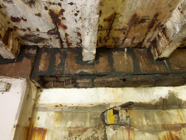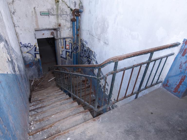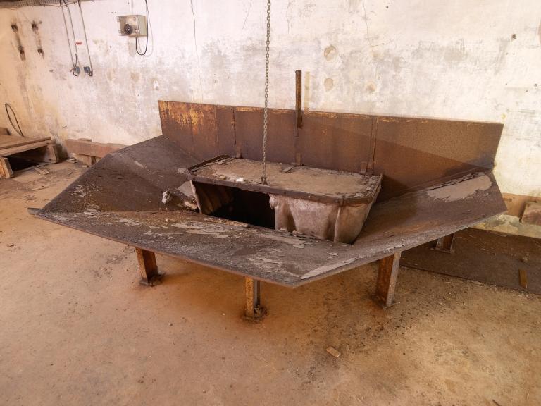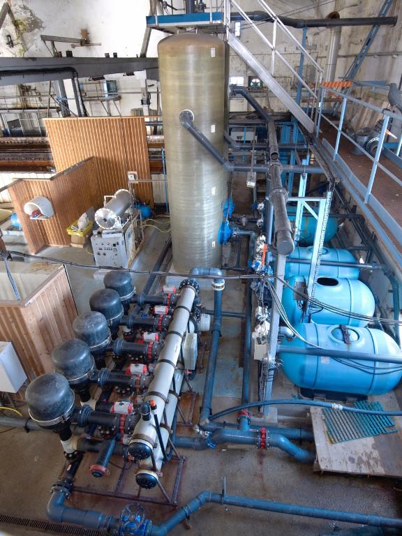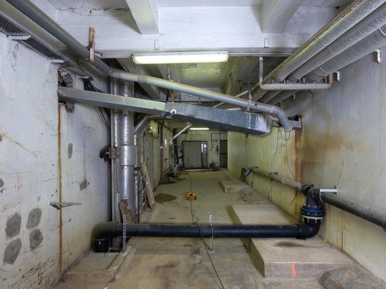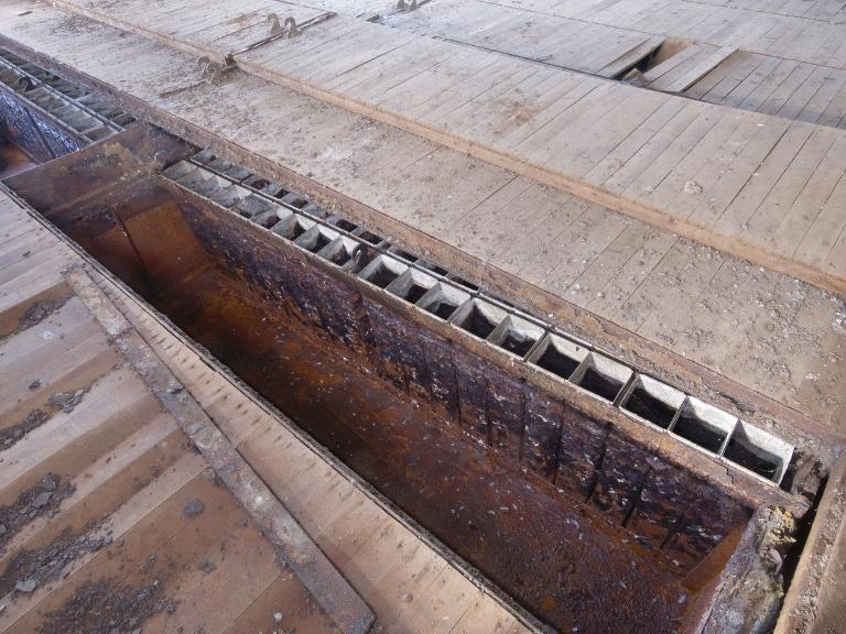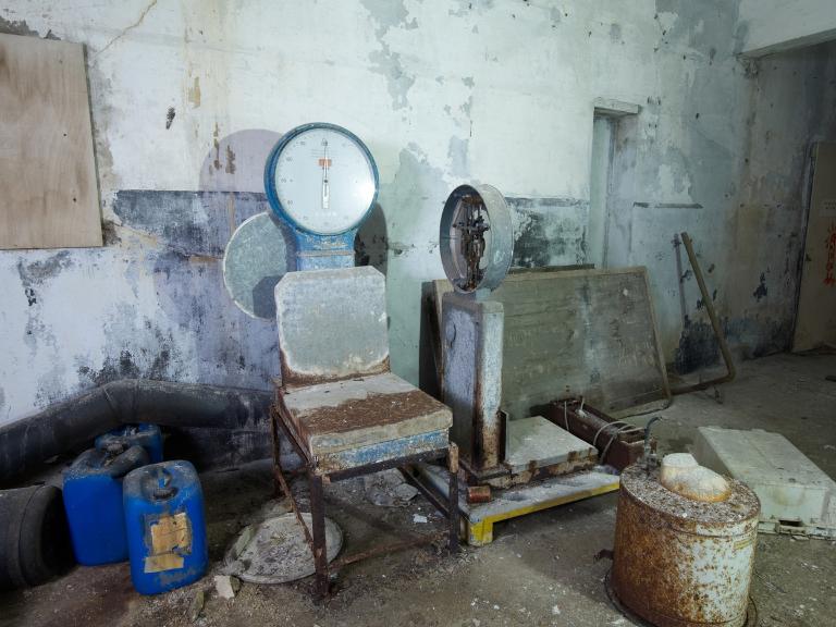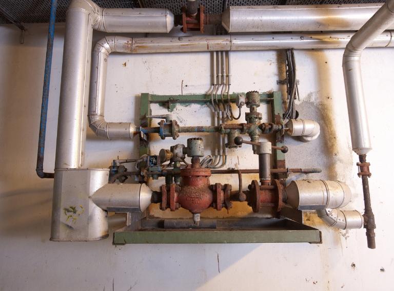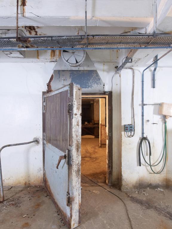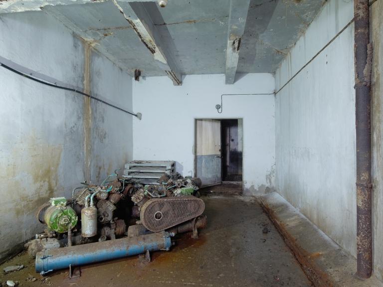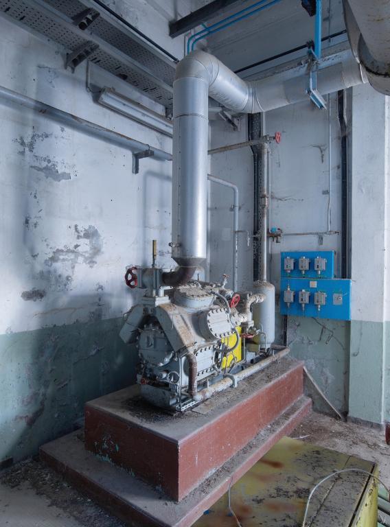 La salle des machines : 5 compresseurs avec moteurs électriques, canalisations d'ammoniaque et 3 groupes de 2 condenseurs. L'eau de mer est utilisée pour réfrigérer les condenseurs. L'ensemble est complété par 2 petites salles où se trouve le transformateur (530 kilowatts) et la réserve de matériels.