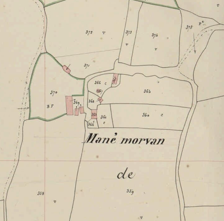 Le logis de la ferme est probablement construit au début du 19e siècle, Il est allongé d'une étable vers l'ouest un peu plus tard (milieu 19e siècl ?). La toiture sans doute en chaume a été remplacée par de l'ardoise synthétique à la fin du 20e siècle<. Après la construction d'un nouveau logis dans les années 1970, l'ancien logis sert de crèche, puis est délaissé. Le puits est contemporain du logis. (C. Toscer)