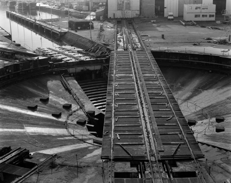 La fosse du pont basculant et tournant du slipway a été reconvertie en bassin de décantation pour le terre-plein de l’aire de réparation navale.