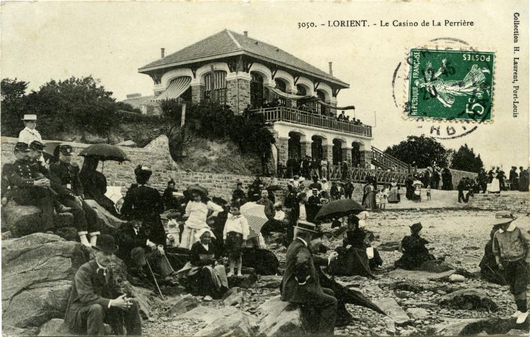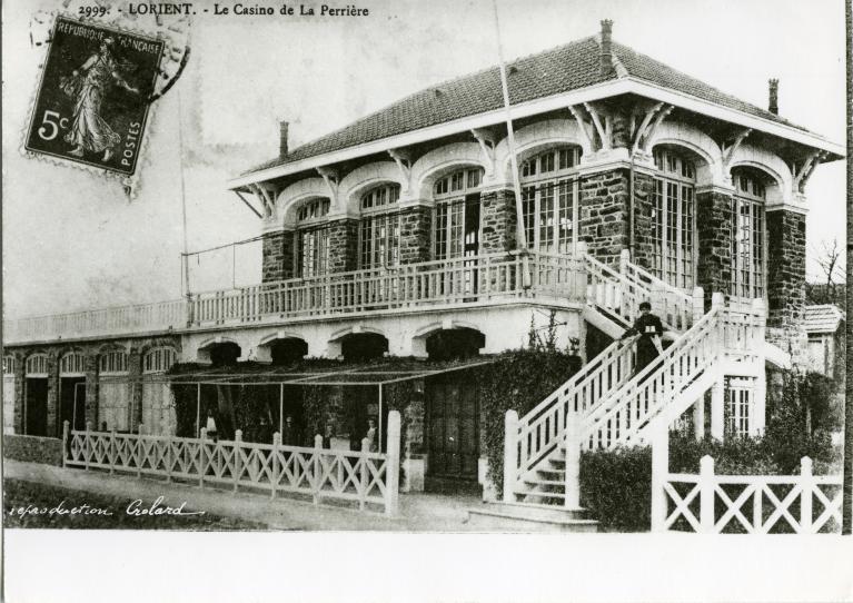 Le casino est inauguré en 1907. Il se situe à proximité de l’embarcadère de la pointe de la Perrière. Cette construction est composée de quatre baies vitrées au rez-de-chaussée et sur sa terrasse. Cette dernière offre un large panorama sur la rade, Kernevel et la citadelle de Port-Louis. Ce lieu est alors très fréquenté par la bourgeoisie lorientaise qui y vient pour observer des courses de régates ou pour écouter des concerts les jeudis et dimanches. Outre son café et son restaurant, on retrouve également un court de tennis et une plage privée équipée de cabine de bains. À partir de la moitié du 19e et jusqu’au début du 20e siècle, le casino de la Perrière devient un lieu dans lequel on se balade, se baigne mais aussi dans lequel on observe le paysage qu’offre la rade. Cette petite cale devient très rapidement un site balnéaire.
