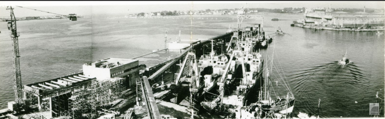 Dessiné en 1919 par Henry Verrière, ingénieur architecte du port de pêche de Keroman, le môle, dit à charbon, est une infrastructure de pointe à l’époque de sa construction : 230 mètres de long sur 27 de large réalisé en béton armé. La dalle repose sur des poutres encastrées qui prennent appui sur de nombreux pieux droits. Il était constitué de silos alimentés côté rade par les caboteurs charbonniers. Les chalutiers à vapeur se fournissaient en charbon côté bassin. Le diesel s’invite ici au début des années 1950. En 1956, il ne reste qu’un chalutier à vapeur à Keroman.