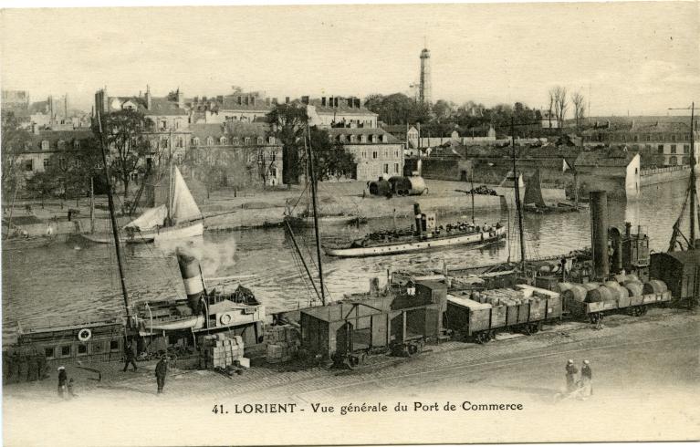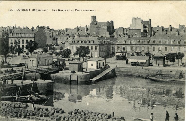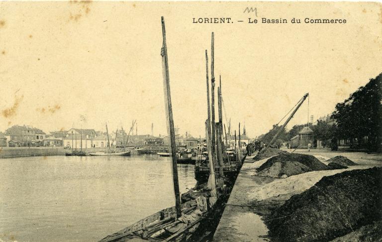 Pour pallier l’envasement du site et permettre aux navires d’accoster, la construction d’un bassin à flot est envisagée à partir de 1836. Un barrage-écluse est alors aménagé de même qu’un contre-quai, sur la rive droite du Faouëdic. Après une trentaine d’années de travaux, le port de commerce de Lorient est inauguré en 1870. Un avant-port permet de décharger les navires dont le tirant d’eau interdit l’entrée dans le bassin à flot. Pour franchir ce dernier, un pont tournant en bois (1848) puis métallique (1868) est aménagé au-dessus de l’écluse. Malgré ces aménagements coûteux (près de trois millions de francs), le port de Lorient « ne dispose pas des armes nécessaires pour être une grande place commerciale ». Vingt-sixième port français en 1860, Lorient est essentiellement un port d’approvisionnement. Il importe de la rogue (appât pour la pêche à la sardine), des denrées alimentaires, du vin, mais surtout du charbon.