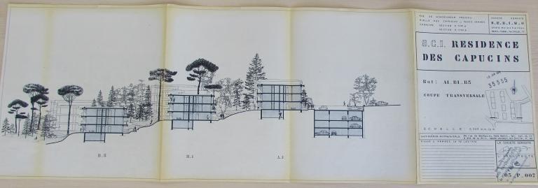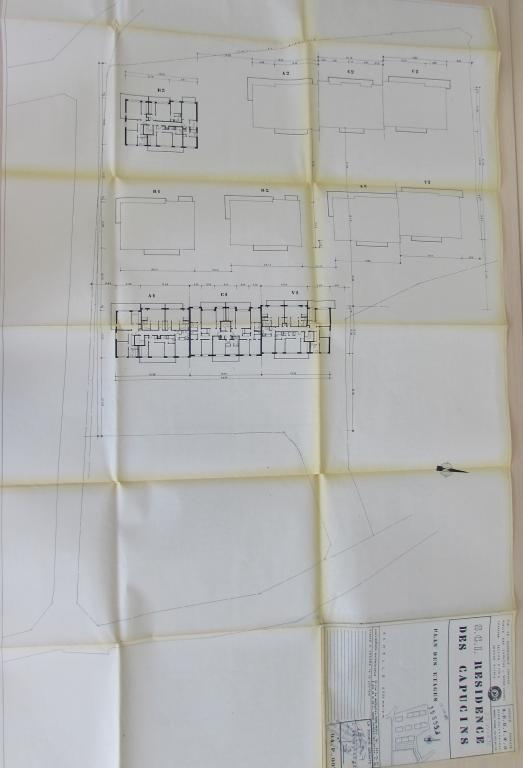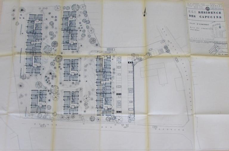 Ensemble de 11 bâtiments individuels et mitoyens de 2 étages carrés sur 3 étages de sous-sol. Larges balcons en façades sauf au nord. L'emprise au sol des immeubles sur la parcelle donne une large part aux plantations d'arbres pour que la réalisation ait un caractère résidentiel de grand standing. Dans le même but, les voitures sont éliminées à l'intérieur même de la propriété. Un parking en surface est situé à l'entrée de la résidence, complétant les garages répartis en trois sous-sols. Seul, le premier sous-sol demeure en parking libre avec accès direct et de niveau par la ruelle des Capucins.