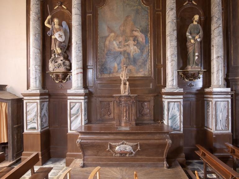 Le Christ est assis. Il porte le perizonium. Son corps est plutôt maigre. On peut compter ses côtes. Quelques rares traces de polychromie rouge sont présentes sur les deux jambes (au niveau des genoux notamment) laissent penser qu’il était couvert de blessures sanglantes dues à la Flagellation.