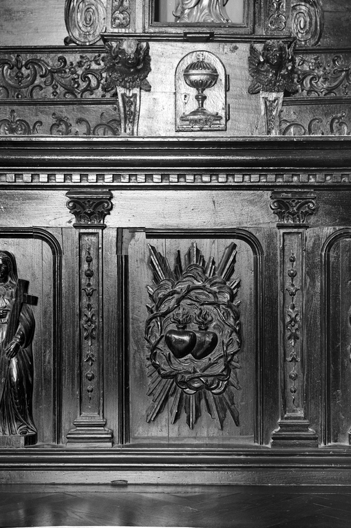 Autel : Sacré-Coeur et vertus cardinales sur antependium ; tabernacle : ciboire et niche d'exposition contenant une statuette de sainte Anne ; retable : niches à dais et draperies écartées par des angelots ; médaillons de couronnement : saint Jean et saint Matthieu en buste.