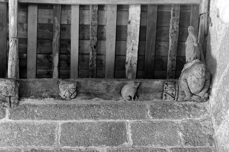 Masques et animaux sur les entraits ; l'about est du mur nord figure un homme assis en tailleur ; extrémités du mur nord : statuettes d'apôtres ; sur les sablières : masques, animaux et feuilles de choux.