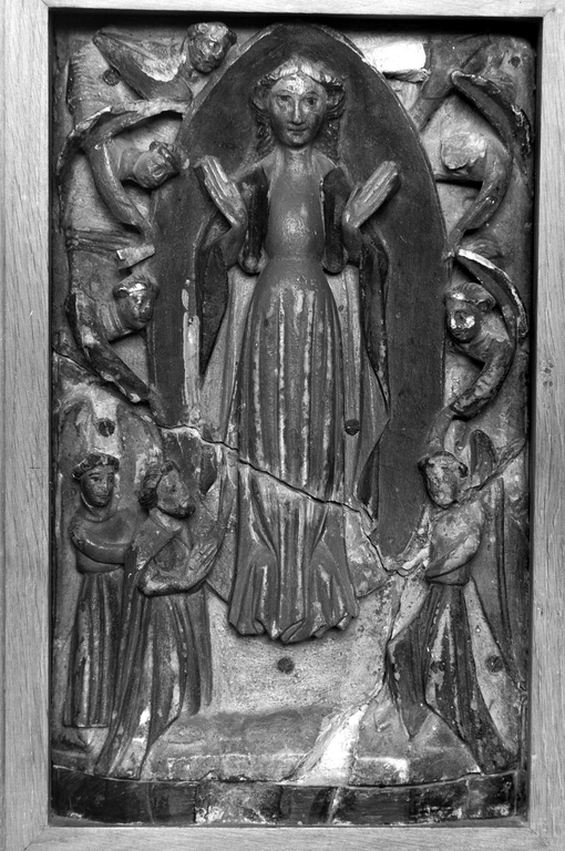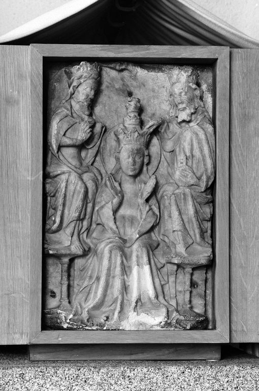 Ensemble de trois panneaux provenant d'un retable, en remploi dans l'autel ; Arbre de Jessé : panneau brisé en trois éléments, tête de l'enfant mutilée ; Assomption : panneau en trois éléments avec manques au niveau des cassures, fixation avec vis apparen.