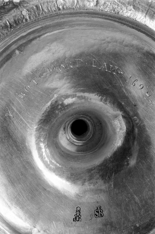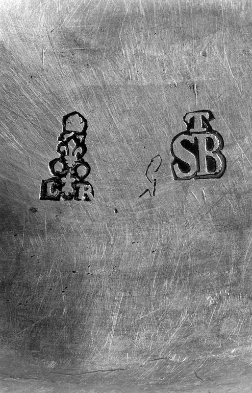 Poinçon de communauté : lettres S et B, un T au dessus (Saint-Brieuc fin 17e début 18e) ; poinçon de maître : lettres L et R, séparées par une hermine, deux grains de remède, une fleur de lys, couronne fermée ; inscription sous le pied : Y ROT MORT LAN 16.