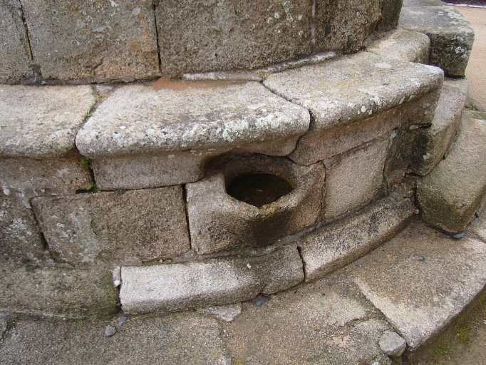 Soubassement à deux assises en pierre de taille et limitées par des corniches moulurées (l'assise supérieure en retrait sur l'assise inférieure). Base de la chaire appareillée surmontée d'une corniche moulurée. Parapet sculpté sur sa face extérieure d'une frise en bas-relief, sommé d'une corniche à frise sculptée de feuillages. Accès à la chaire par neuf marches au nord. Au centre de la chaire, croix à fût monolithe de section circulaire. Noeud à la base de la croix avec culots latéraux anthropomorphes.