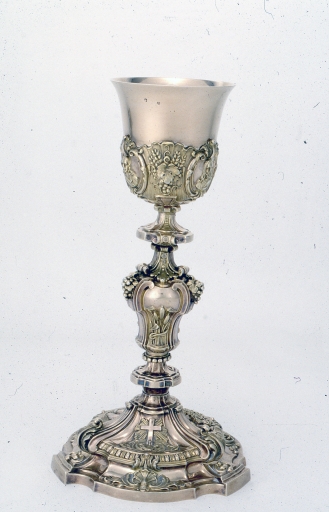 Description : la Cène sur la patène, les figures bibliques en médaillon sur la fausse coupe, les instruments de la Passion et l'Agneau mystique sur le pied du calice.