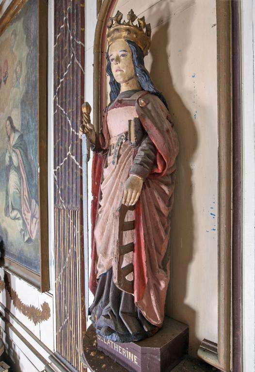 Sainte Catherine d'Alexandrie est représentée debout tenant dans sa main droite une très longue épée reposant au-delà du socle. Elle maintient sous son bras gauche un livre et une roue. Elle a une position droite en lien avec l'épée, particulièrement mise en avant.