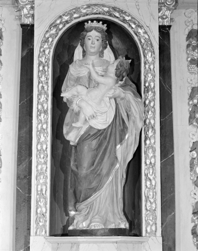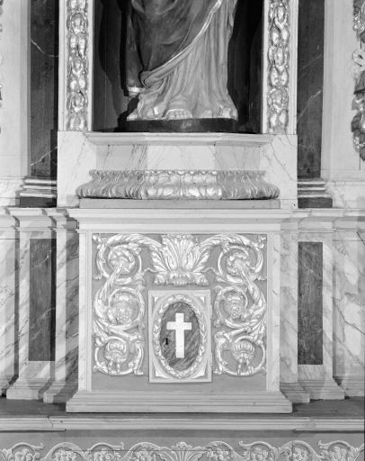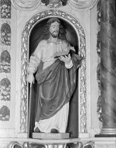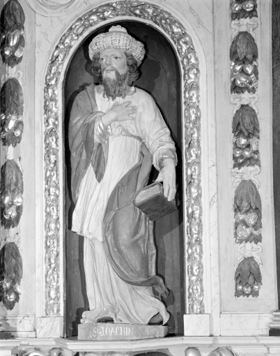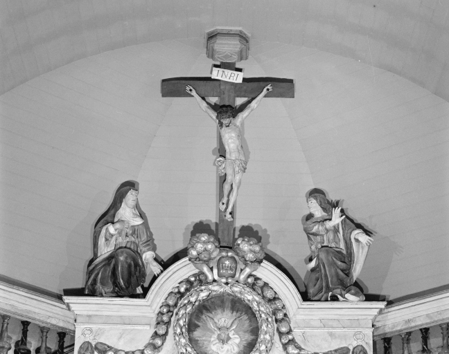 Retable à 3 travées avec statue de la Vierge à l'Enfant au centre, statue de saint Joseph à gauche, statue de saint Joachim à droite ; Saint-Esprit sur le fronton ; au sommet, groupe sculpté du calvaire.