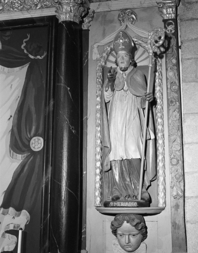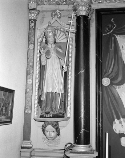 Saint Lin, pape, bénissant et saint Mériadec, évêque, bénissant ornent le retable nord ; saint Gall, moine avec mitre déposée à ses pieds et saint Benoît, abbé, ornent le retable sud.