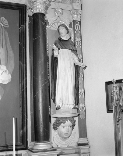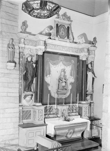 Ensemble de 2 autels retables latéraux identiques, ornés chacun de 2 statues en bois polychrome ; autre statue (dossier individuel) au centre de chaque retable dont le fond est garni d'une peinture à l'huile sur panneau représentant un semis d'hermines décoratives.