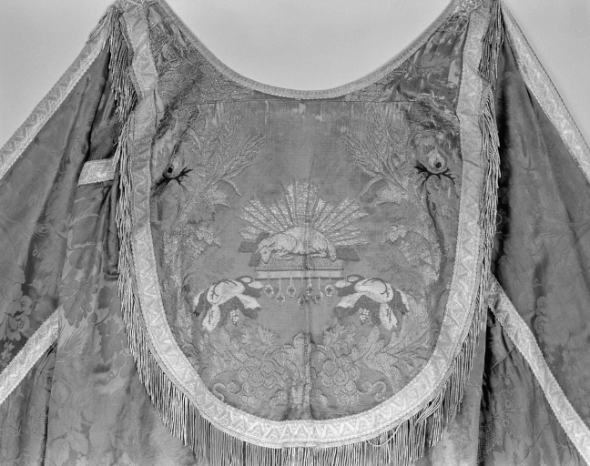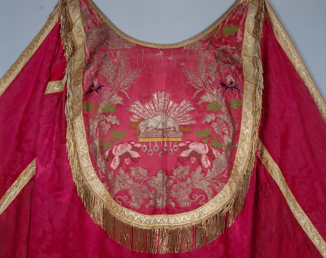 Chape en damas de soie rouge cramoisi, galon en fil d'or, décor tissé et brodé.