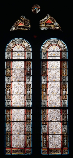 Verrière ornementale du 19e siècle avec remploi de quelques pièces de bordure du 16e siècle à motifs décoratifs en grisaille et jaune d'argent sur verre blanc.