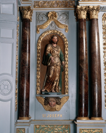 Autel et retable du 18e siècle, restaurés en 1991 par Hémery (démontage, polychromie, remontage) .