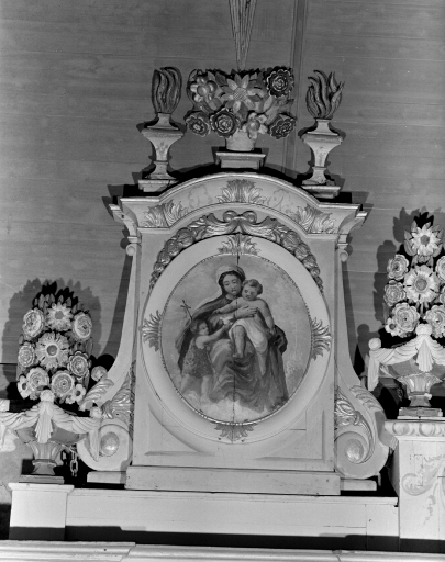 Retable orné d'un tableau du Rosaire ; devant d'autel orné d'une peinture représentant le couronnement de la Vierge par le Christ et Dieu le Père.