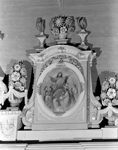 Autel-retable en bois polychrome, orné d'un tableau central et d'une peinture sur toile (devant d'autel) .