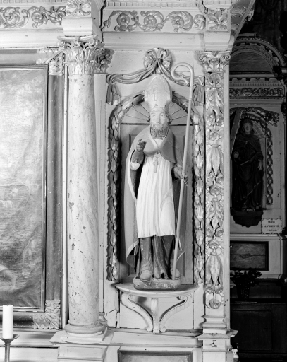 Saint Hubert, à gauche ; saint Lubin à droite ; statues monoxyles sauf les mains droites des deux statues et la crosse de saint Lubin.