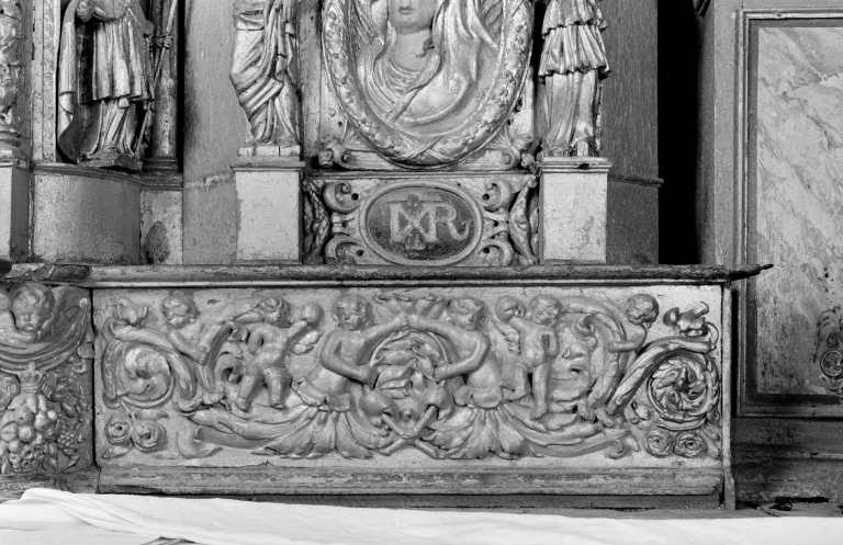 Le tabernacle est orné du Christ en croix, de la sainte face, de statuettes cariatides, de deux évêques et, sur les ailes, de deux médaillons ovales figurant le Christ à gauche et la Vierge à droite ; au niveau du couronnement sont figurés Dieu le Père en.