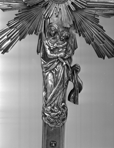 Croix à noeud en toupie, Christ en ronde bosse, Vierge à l'Enfant en relief, repoussé ciselé ; les rayons sont dorés. Absense de technique de fonte.