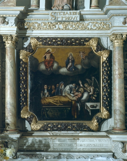 Mort d'un homme alité, en présence d'un prêtre, d'un ange et de personnages en larmes. Dans une nuée, le Christ et la Vierge.