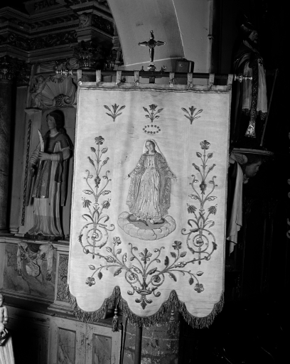 Bannière en soie blanche avec application du décor ornemental et figuré.