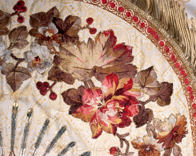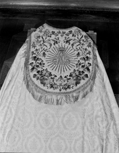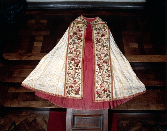 Chape en soie blanche et or ; le devant et le chaperon sont ornés de motifs floraux brodés et appliqués sur le fond.