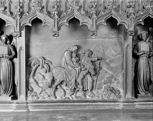 Le retable porte les statues de la Vierge et des saints et les 6 statuettes d'anges tenant des phylactères ; le devant d'autel est orné de la fuite en Egypte et de l'annonciation.