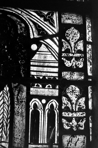 Verrière conservant des panneaux du début du 14e siècle, très restaurée. Parties modernes : panneaux inférieurs.
