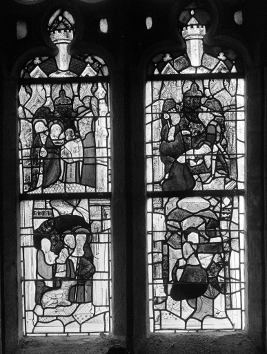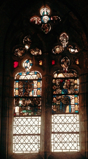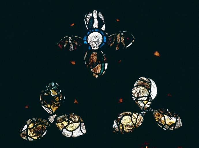 Verrière datant de la 2e moitié du 14e siècle. Très remaniée. Nombreux verres modernes.