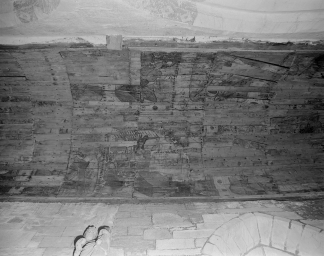 Scènes de la création sur le lambris de la nef centrale : Dieu le Père, mariage d'Adam et Eve, tentation d'Adam et Eve, Adam et Eve au travail, sacrifices d'Abel et Caïn, meutre d'Abel. Vie de la Vierge et enfance du Christ, sur le bas-côté sud : anges mu.