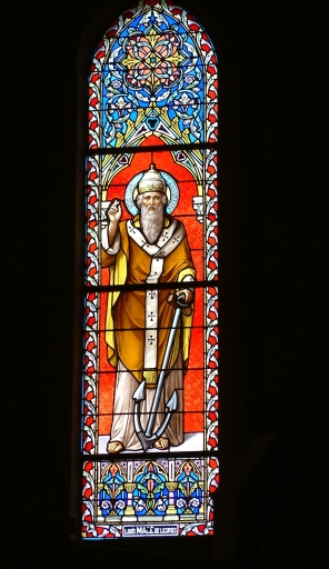 Ensemble de trois verrières à une lancette représentant un personnage en pied : saint Lunaire, sacré coeur, saint Clément.