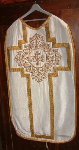 Chasuble blanche avec motif cousu au dos : IHS dans un quadrilobe. Doublure rouge. Bourse avec soufflet en soie rouge et motif de croix grecque.