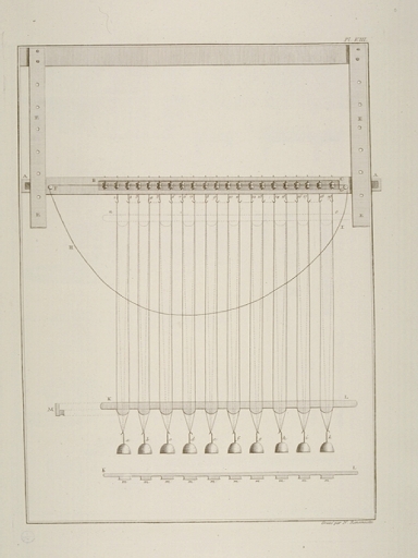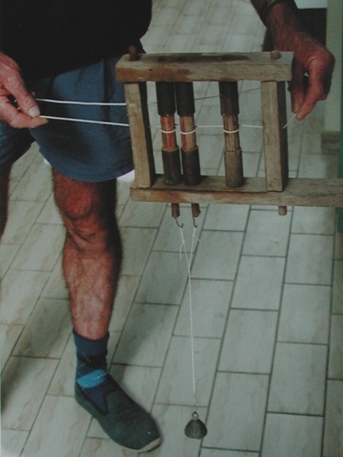 Cadre en bois de 30 cm de long sur 20 cm de large, muni de plusieurs fuseaux mobiles, avec un piton à l'extrémité servant de tour pour toronner les fils de pêches ensemble. Les fils sont reliés à un plomb.