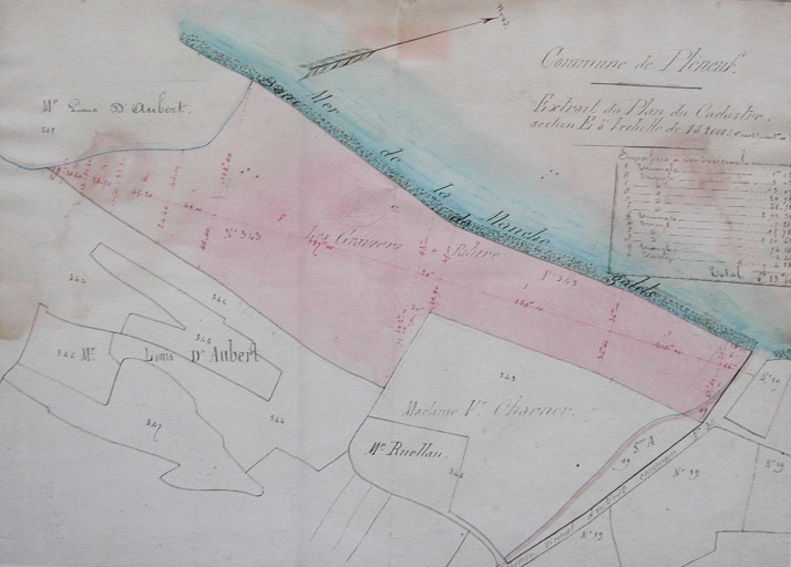 Extrait du plan cadastral de 1846 : achat des communs de la commune de Pléneuf par la société Cotard en 1880 (archives du notaire Guinard de Pléneuf). Vente consentie par Arthur de la Goublaye de Nantois, agissant comme maire de Pléneuf, assisté de Olivier Sorgniard, minotier, demeurant au Moulin Madeuc en Pléneuf, à la Société Charles Cotard, Hallam de Nittis et Cie, formée par acte sous seing privé, le 10 août 1880, déposé en l'étude de maître Labouret, notaire à Paris. Acquisitions en la commune de Pléneuf : - section A N° 4, parcelle dite les "Communs du Château", contenant 1 hectare, 38 ares 57 centiares, joignant du levant et du nord à portion de 2 hectares résservés par la commune et affectés exlusivement à l'exploitation des carrières ; - section 4 N°19, parcelle dite"Les Graviers des Monts-Colleux", contenant 4 hectares 71 ares 53 centiares ; - section E N° 343, parcelle dite "Les Graviers des Garennes", sous pâture, contenant 6 hectares 13 ares 66 centiares. La commune de Pléneuf s'engage à faire enlever les cabanes de bains plantées sur les terrrains vendus d'ici le 1er janvier 1881. La Société dépensera une somme minimum de 30 000 fcs en construction, terrassements ou aménagements sur les terrains, et ce dans un délai de 2 ans de ce jour. La commune se réserve le terrain nécessaire à divers chemins, un droit de passage pour piétons pour aller faire la pêche sur la pointe de la Lingoire. La commune se réserve à l'usage de la place publique, la portion des Graviers des Monts-Colleux, située au nord de la propriété Dault sur toute sa largeur, comprise entre la mer et le chemin. Elle s'interdit toute construction fixe sur le dit terrain, à l'exception des cabines de bains actuellement existantes qui devront y être transportées et celles dont la commune pourra autoriser ultérieurement l'établissement. La Société s'engage à laisser le passage libre sur une largeur de 10 mètres sur de la mer.