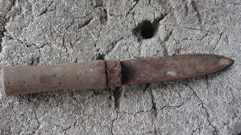 Couteau piqueur : outil en fer forgé ressemblant à un couteau avec une forte lame à bout rond, de 15 cm de longueur et de 3 cm de largeur, munie d'une virole en fer. Longueur totale avec le manche : 26 cm. Outil en fer forgé ressemblant à un couteau avec une forte lame à bout carré, de 12 cm de longueur et de 5 cm de largeur, munie d'un caoutchouc de protection et une bague de plomb pour équilibrer l'ensemble. Longueur totale avec le manche : 24 cm.