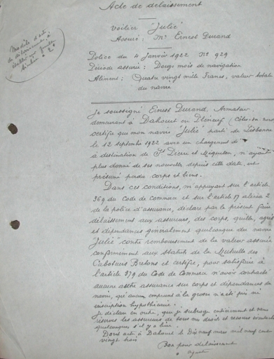 Ernest Durand (1872-1951), fils d'Emile Durand, lui même capitaine au long cours, fut d'abord marin : il établit le record de l'Atlantique en 12 jours sur la "Rochejaquelein", record qui ne sera battu que par Eric Tabarly qu'en 1980 ; avant de devenir armateur de nombreux navires et négociant. Il fit construire deux goélettes, dont la "Julie", perdue en 1922 et la "Fursty". La "Julie" fut construite au chantier Bonne-Lesueur en 1913 (24 m de quille) et ne fut jamais motorisée (lettres de devis des chantiers Bonne et Gautier). Elle effectuait des voyages au Portugal, avec un fret de 200 t. de pommes de terre (variété Chardonne et la Beauvais), pour prendre du sel, acheminé ensuite à Saint-Pierre et Miquelon, d'où elle ramenait la morue salée à Bordeaux. Elle livrait aussi du charbon à Swansea et des poteaux de mines pour le Pays de Galles. C'est lors de l'un de ses voyages qu'elle se perdit corps et biens après son départ de Lisbonne le 12 septembre 1922, avec la capitaine pleubianais Libouban (acte de délaissement du 4 janvier 1922). Le livret maritime de Ernest Durand précise ses voyages au cabotage entre la Grand-Bretagne et les côtes françaises. Son fascicule de mobilisation pendant la guerre 1914-18 indique ses états miltaires de service.
