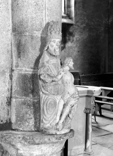 Cette oeuvre artisanale de bonne qualité date vraisemblablement du 16e siècle. Il faut noter l'intéressant contraste entre le hiératisme du Père, reflétant la tradition médiévale, et le mouvement tournant du Christ, qui est l'occasion d'une bonne étude anatomique (mouvement des jambes parallèles et des pieds, tous deux posés, mais à des niveaux différents). Le mauvais état de conservation ne permet pas de déterminer s'il y a eu assemblage ou non d'une colombe rapportée. Il existe des analogies, dans le parti général de la composition, avec le groupe de la Trinité de l'église paroissiale de Saint-Gilles-Pligeaux.