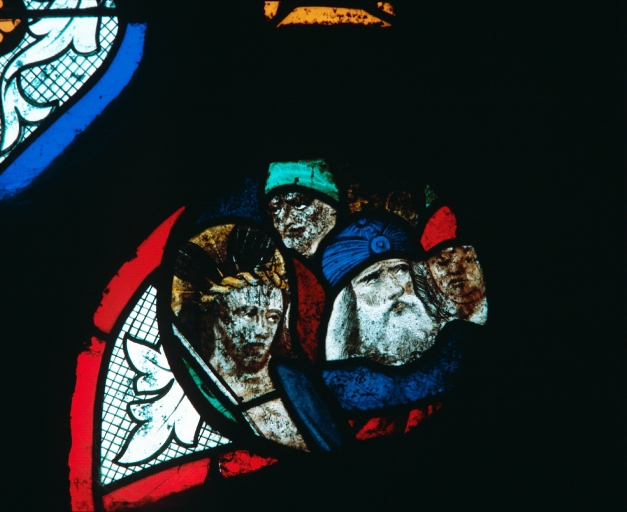 Oeuvre du 16e siècle, dont on peut souligner la variété et l'éclat des coloris ainsi que le traitement habile et expressif des visages. D'après les archives paroissiales, en 1883-1884, Laigneau effectue le remontage de fragments provenant de deux verrières : la tête du Christ et celle de l'homme de la partie supérieure appartiendraient à la scène du Couronnement d'épines, Joseph d'Arimathie et le personnage à sa gauche à une scène de Déposition.