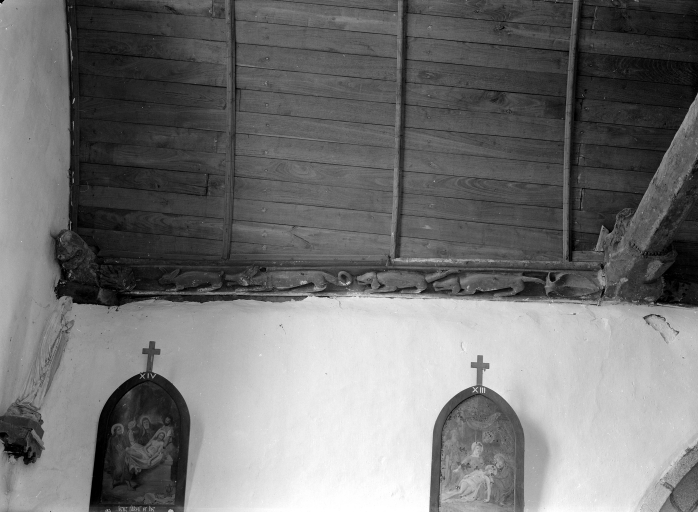 Ensemble composite de pièces de charpente, réalisé par plusieurs mains probablement lors de campagnes différentes du 16e siècle : les deux tronçons du bras nord sont d'une exécution plus nerveuse et plus précise (fig.8 et 11-13) .