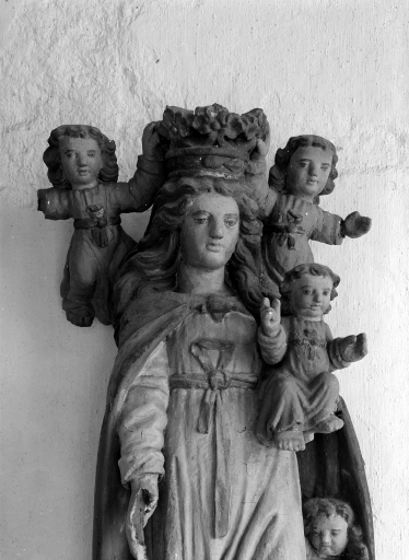 La statue présente des vermoulures, la peinture est écaillée, la main droite de l'ange de gauche, l' index, le pouce droit de la Vierge ainsi que son sceptre ont disparu.