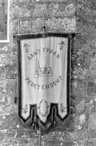 Inscription en latin sur un phylactère tenu par saint Yves : In judicando esto pupillis misericor...pro nat. Au revers, inscription en breton brodée de perles : SANT YVOAN PEDET EVID OMP" [saint Yves priez pour nous].
